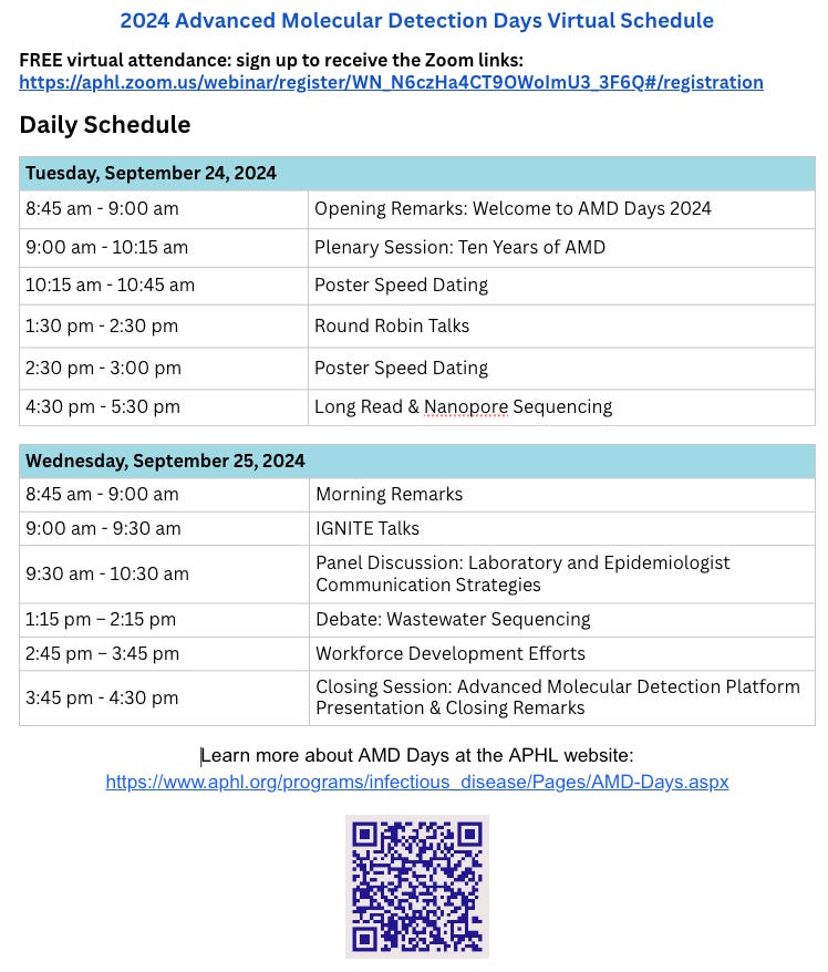 I’m always excited the week before a conference or event. Especially now that I work from home all the time, the chance to meet with others who are just as excited about the same nerdy things is such a treat. Next week I’ll be in Atlanta (well, Decatur, but close enough) at the CDC/APHL Advanced Molecular Detection (AMD) Days conference. I haven’t attended this event before, but one thing I’m excited about is that it intentionally draws attendees from both the laboratory/bioinformatics and epidemiology. Another exciting aspect is that a number of the sessions will be available for remote attendance through Zoom! If you won’t have a chance to be in Atlanta, this is a great option to let you get insight on the hot AMD topics in the US. The subset of sessions that will be available for virtual attendance are listed out in the tables below.