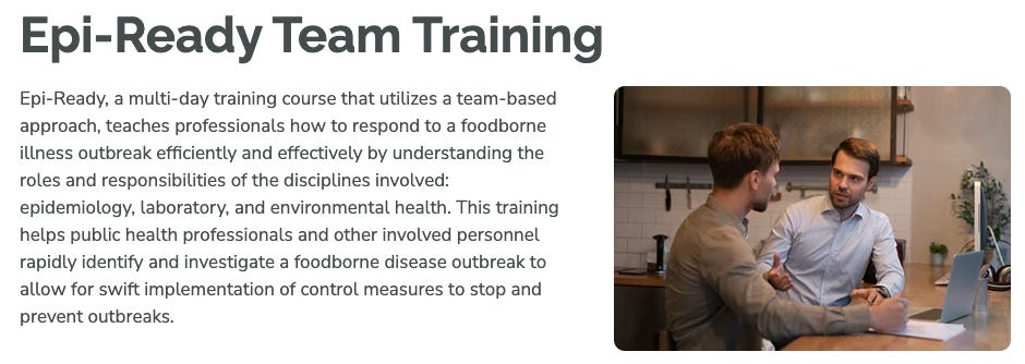 Another way that the enteric disease community promotes interdisciplinary collaboration is through the Epi-Ready Team Training. This multi-day training is taught by representatives from epidemiology, laboratory, and environmental health, again exposing all learners to experts both in their field and the other two fields. This training may be the first time an epidemiologist gets to hear directly from the lab what happens to a specimen once it enters the lab, or for the lab to see an environmental health professional walk through pictures of how they collect swabs during field investigations. This type of training can be helpful in building everyone up to a base level of knowledge and vocabulary that can greatly enhance collaboration.