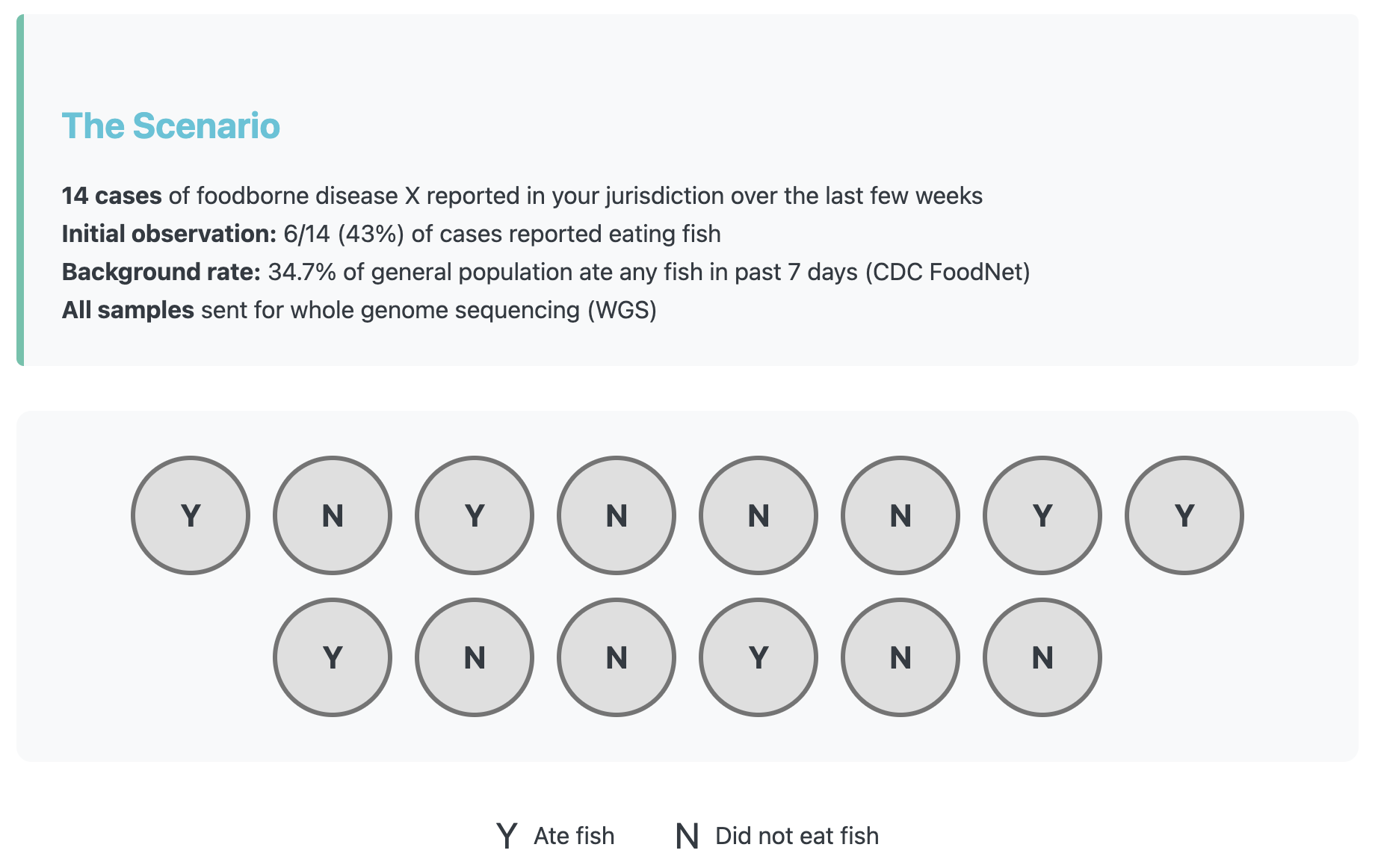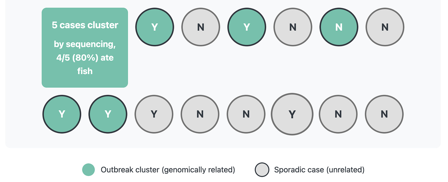 After sequencing, you find out that only 5 cases are closely related by sequencing, and of those 5 cases 4/5 or 80% ate fish. That’s a much stronger signal! By narrowing our case definition through incorporating sequencing data, it is much easier to sort out the signal from the noise in the exposure data and narrow down what exposures should be investigated further.