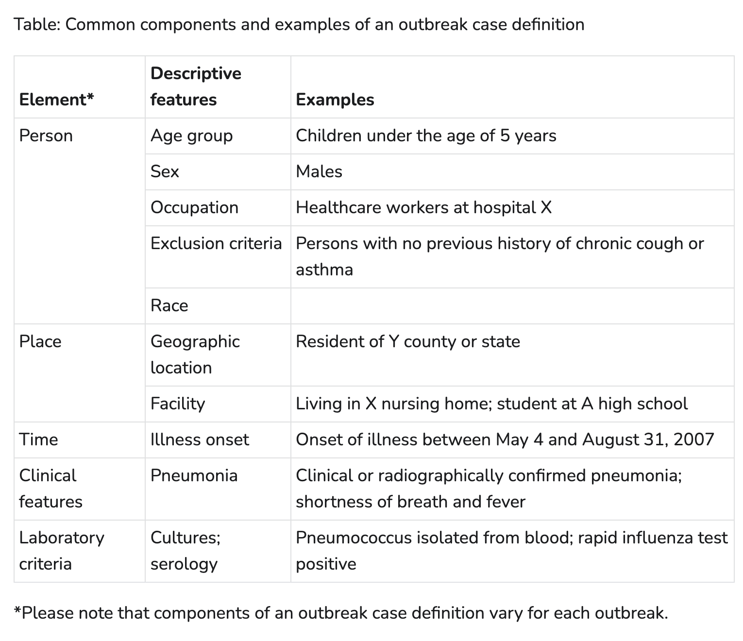 Case definitions are typically made up of a few parts - person, place, time, clinical, and laboratory criteria. Not every outbreak will have every aspect included, but this is pretty good start. The table below from the CDC’s Outbreak and Case Definition site gives some examples of how those elements can be applied.