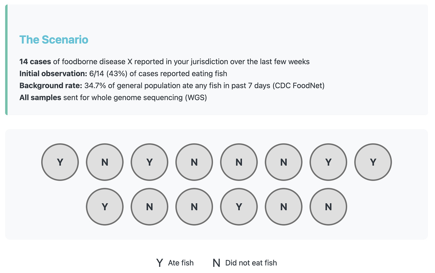 Lets make up an example to show how misclassification can completely change the outcome of an analysis. In our scenario there are 14 cases of foodborne disease X in your jurisdiction over the past two weeks. While you wait for the sequencing data to come in, you take a first look and notice that 6/14 (43%) of the cases reported eating fish during their exposure period. That piques your interest, but when you compare it to the reported background rate which is 34.7% it’s not too different.