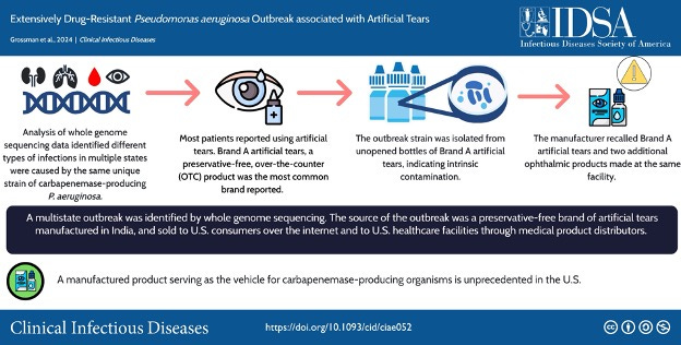Alexander J Sundermann, Vatsala Rangachar Srinivasa, Emma G Mills, Marissa P Griffith, Kady D Waggle, Ashley M Ayres, Lora Pless, Graham M Snyder, Lee H Harrison, Daria Van Tyne, Two Artificial Tears Outbreak-Associated Cases of Extensively Drug-Resistant Pseudomonas aeruginosa Detected Through Whole Genome Sequencing–Based Surveillance, The Journal of Infectious Diseases, Volume 229, Issue 2, 15 February 2024, Pages 517–521, https://doi.org/10.1093/infdis/jiad318