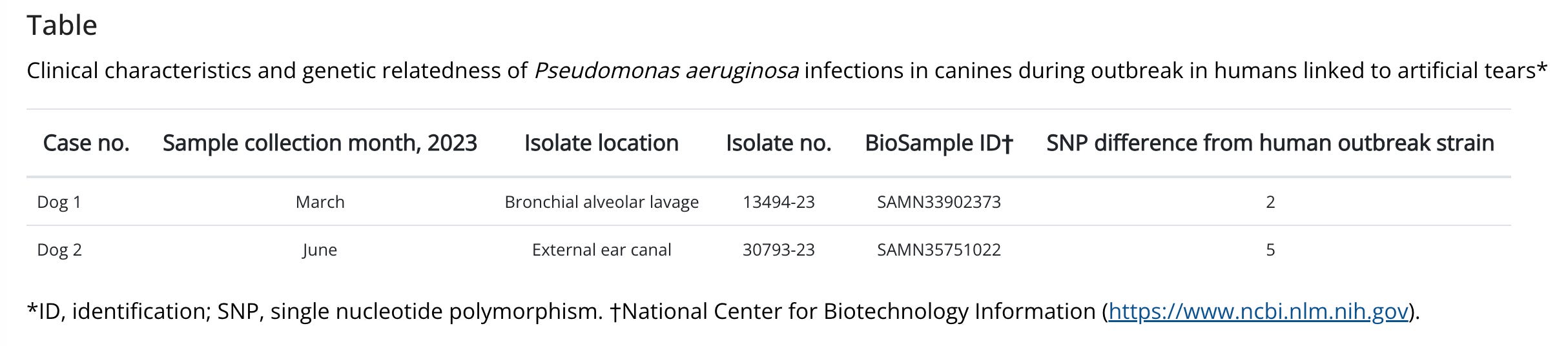 Price, E. R., McDermott, D., Sherman, A., Kelley, L., Mehr, J., Greeley, R....Cole, S. D. (2024). Canine Multidrug-Resistant Pseudomonas aeruginosa Cases Linked to Human Artificial Tears–Related Outbreak. Emerging Infectious Diseases, 30(12), 2689-2691. https://doi.org/10.3201/eid3012.240085.